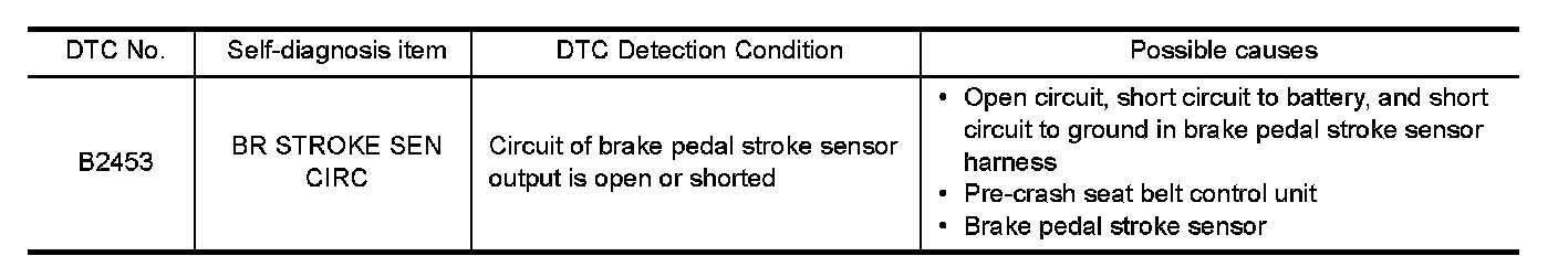 - There are 2 signals (brake pedal stroke sensor 1 and 2) sent from the brake pedal stroke sensor. Pre-crash seat belt control unit judges the stroke amount and the speed of the brake pedal according to the voltage of the signal sent by each side.