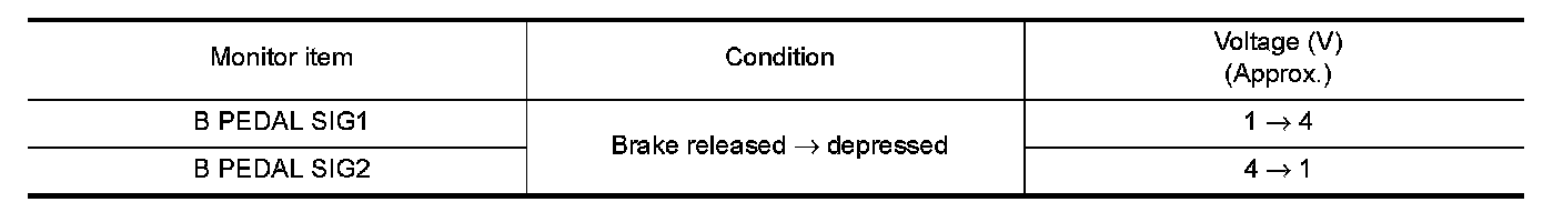 3.Check "B PEDAL SIG1" and "B PEDAL SIG2" indication under the following conditions.