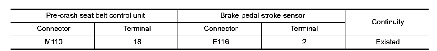 2.Check continuity between pre-crash seat belt control unit harness connector and brake pedal stroke sensor harness connector.