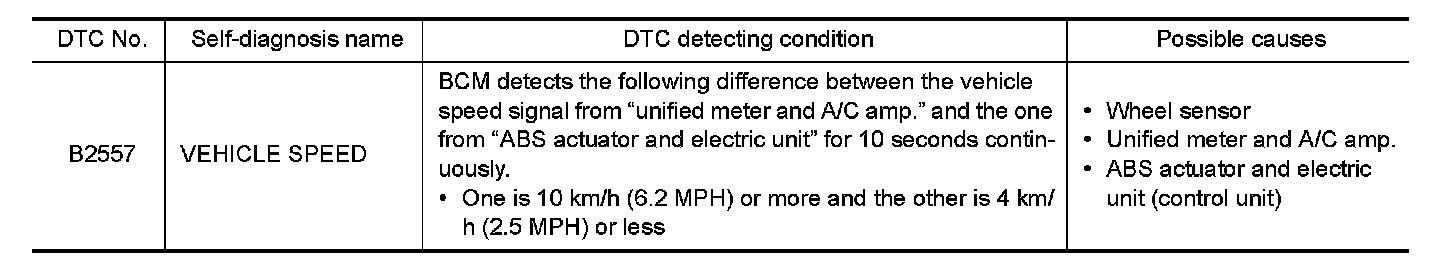 BCM receives 2 vehicle speed signals via CAN communication. 1 signal is transmitted by the "unified meter and A/C amp.". Another signal is transmitted by "ABS actuator and electric unit (control unit.)". BCM compares both signals to detect the vehicle speed.