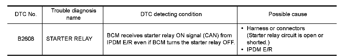 Located in IPDM E/R, the starter relay runs the starter motor. The starter relay is turned ON by the BCM when the ignition switch is in the START position. IPDM E/R transmits the starter relay ON signal to BCM via CAN