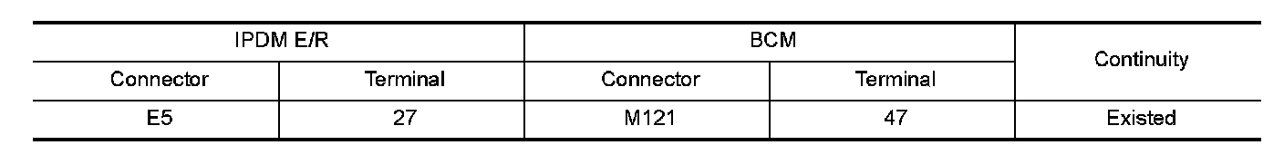 2.Check continuity between IPDM E/R harness connector and BCM harness connector.