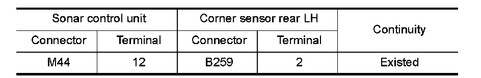 Check continuity between sonar control unit harness connector and corner sensor rear LH harness connector.