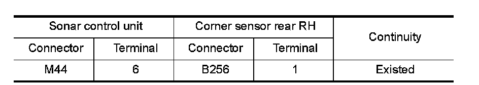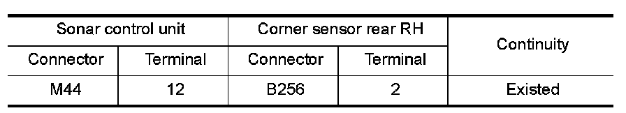 3.Check continuity between sonar control unit harness connector and corner sensor rear RH harness connector.
