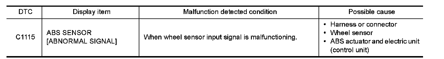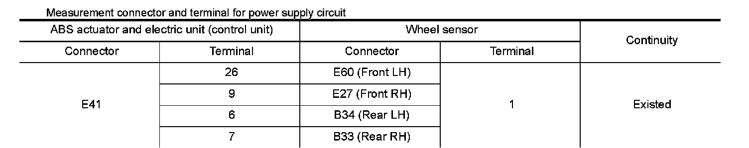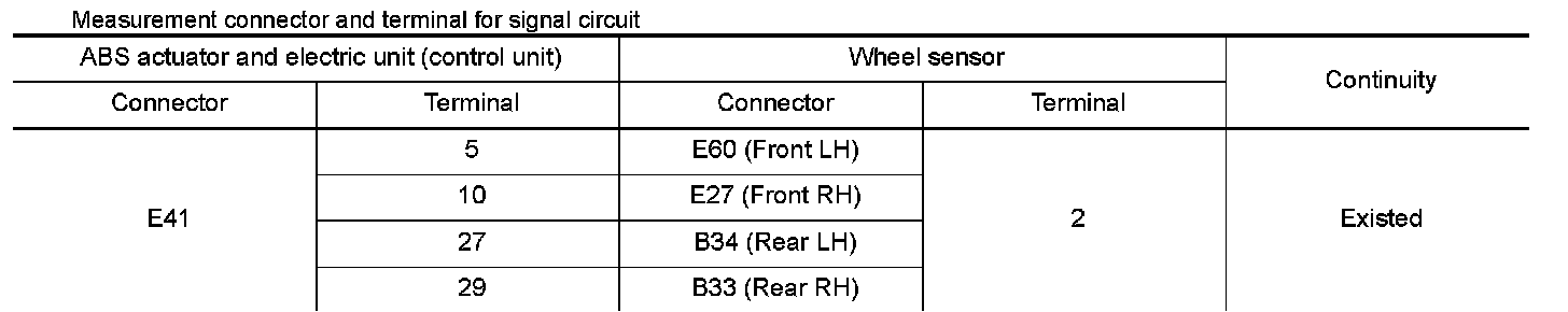 4.Check the continuity between ABS actuator and electric unit (control unit) harness connector and wheel sensor harness connector. (Check the continuity when steering wheel is steered to RH and LH, or center harness in wheel housing is moved.)