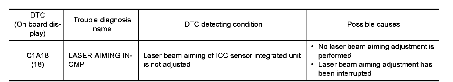 Adjust the laser beam aiming of the ICC sensor integrated unit. Refer to "LASER BEAM AIMING ADJUSTMENT : Description" Description.
