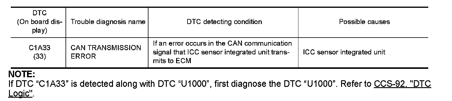 If DTC "C1A33" is detected along with DTC "U1000", first diagnose the DTC "U1000". Refer to "DTC Logic" Cruise Control.
