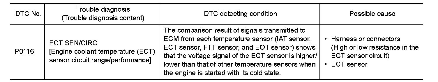 If DTC P0116 is displayed with P0117 or P0118, first perform the trouble diagnosis for DTC P0117, P0118. Refer to "DTC Logic" P0117.