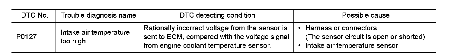 The intake air temperature sensor is built-into mass air flow sensor (bank 1) (1). The sensor detects intake air temperature and transmits a signal to the ECM.
