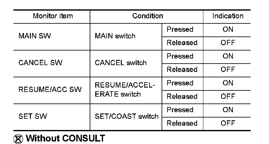 2.Select "MAIN SW", "CANCEL SW", "RESUME/ACC SW" and "SET SW" in "DATA MONITOR" mode with