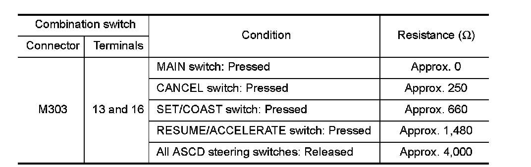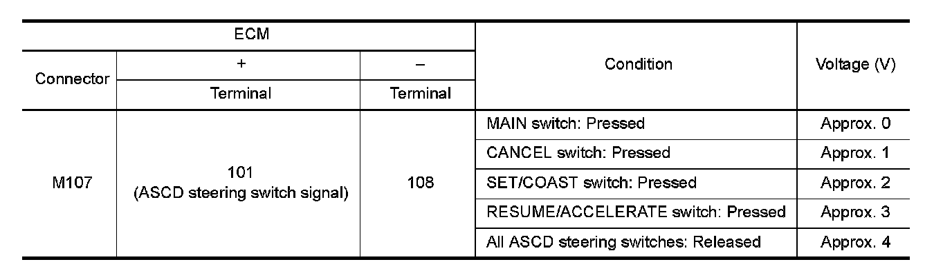 ASCD steering switch has variant values of electrical resistance for each button. ECM reads voltage variation of switch, and determines which button is operated.