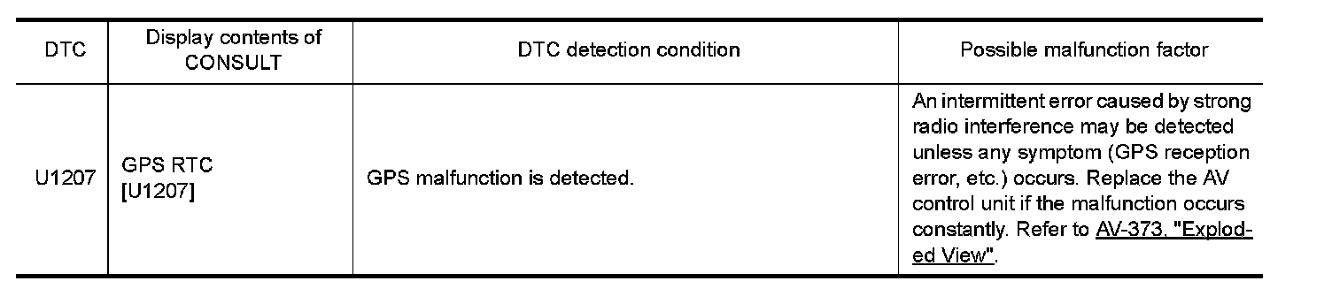 An intermittent error caused by strong radio interference may be detected unless any symptoms (GPS reception error, etc.) occur. Replace the AV control unit if the malfunction occurs constantly. Refer to "Exploded View" With Navigation.