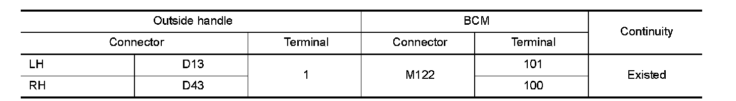 2.Check continuity between malfunctioning outside handle harness connector and BCM harness connector.