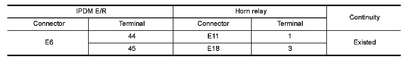 3.Check continuity between IPDM E/R harness connector and malfunctioning horn relay harness connector.