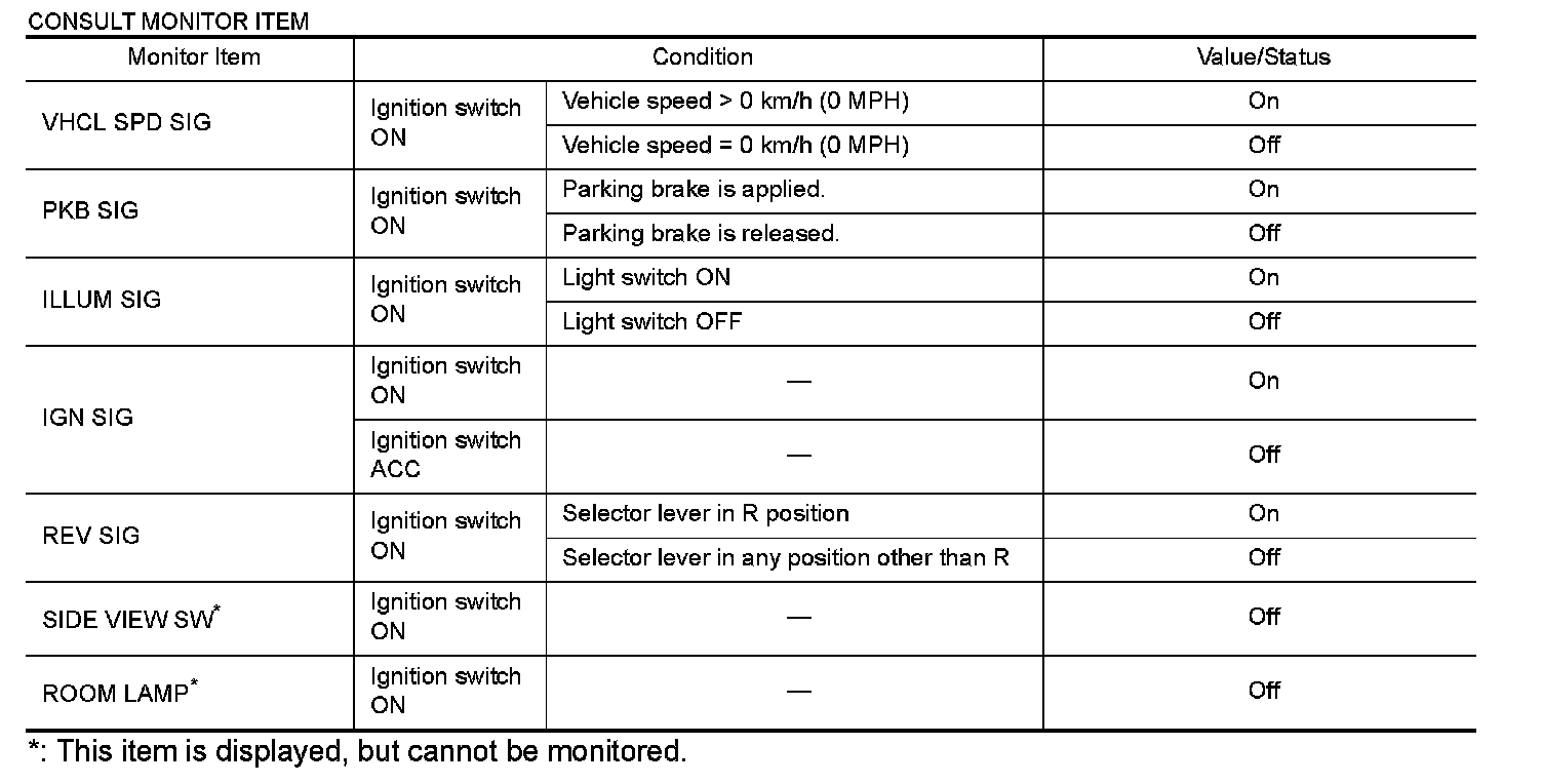 The following table includes information (items) inapplicable to this vehicle. For information (items) applicable to this vehicle, refer to CONSULT display items.