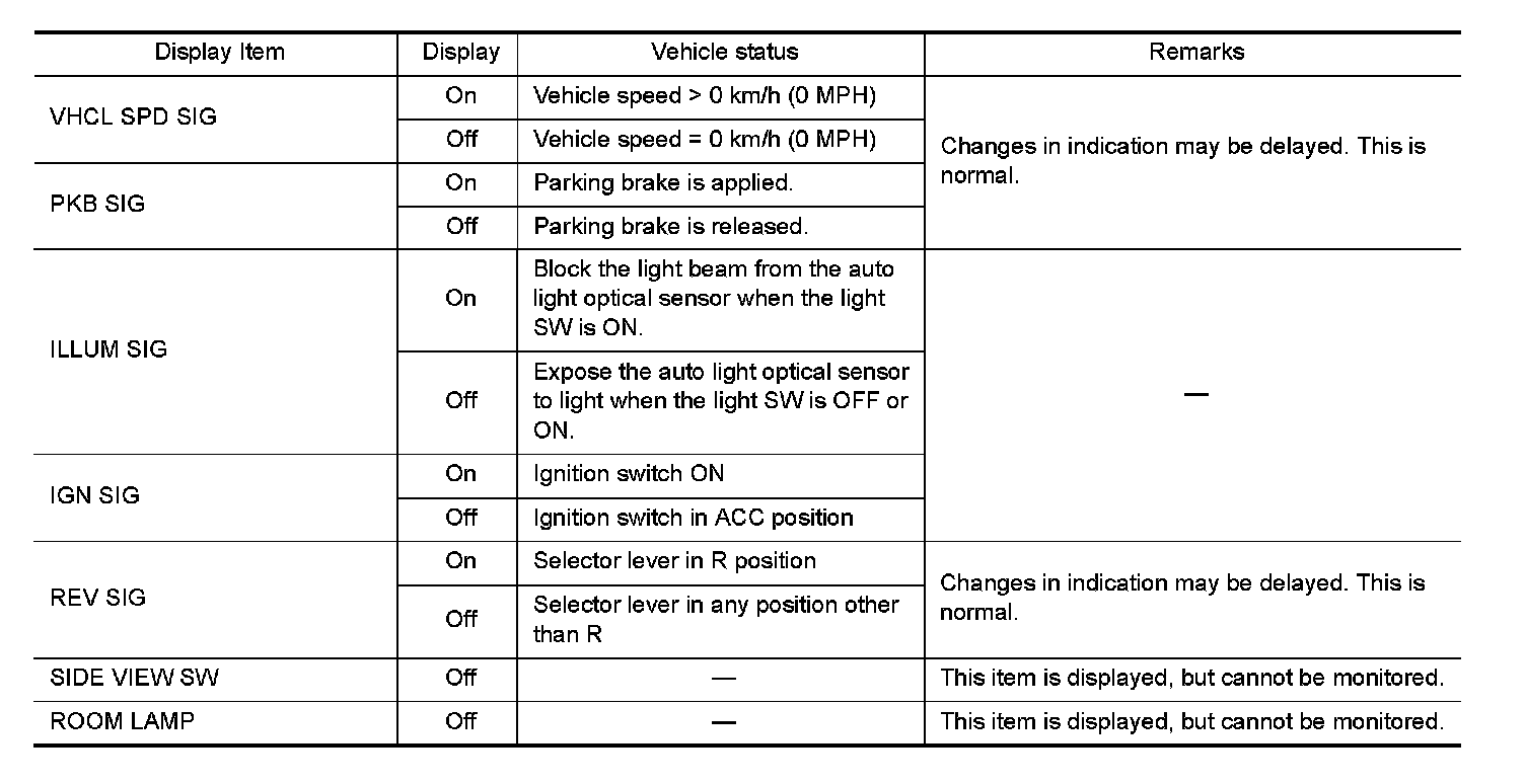 - Displays the status of the following vehicle signals inputted into the AV control unit.
