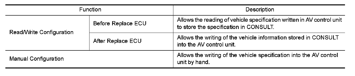 CONSULT performs the following functions via the communication with the AV control unit.