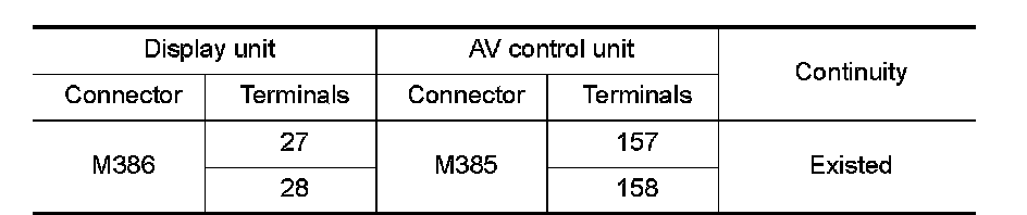 3.Check continuity between display unit harness connector and AV control unit harness connector.