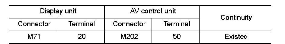 3.Check continuity between display unit harness connector and AV control unit harness connector.