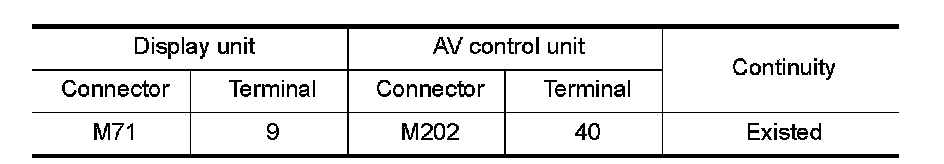 3.Check continuity between display unit harness connector and AV control unit harness connector.