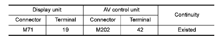 3.Check continuity between display unit harness connector and AV control unit harness connector.