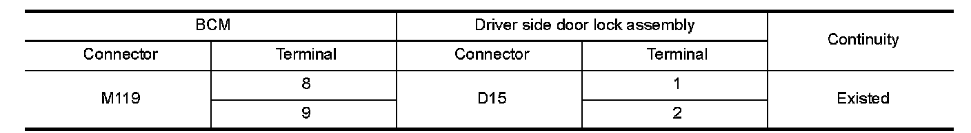 2.Check continuity between BCM harness connector and driver side door lock assembly harness connector.
