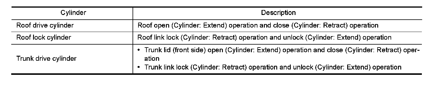 Retractable hard top control unit switches hydraulic pump rotation direction, hydraulic circuit by switching valve 1/2 ON or OFF, and extends or retracts each cylinder. Operation according to each parts state is as shown in the following table.