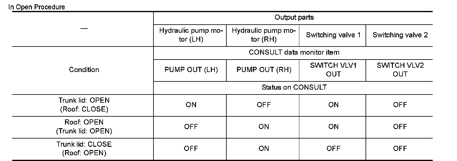 Parts state (CONSULT display) according to sequential hydraulic system operations is as shown in the following table.