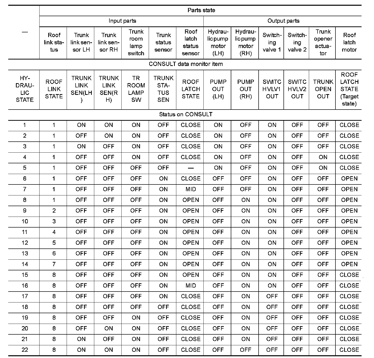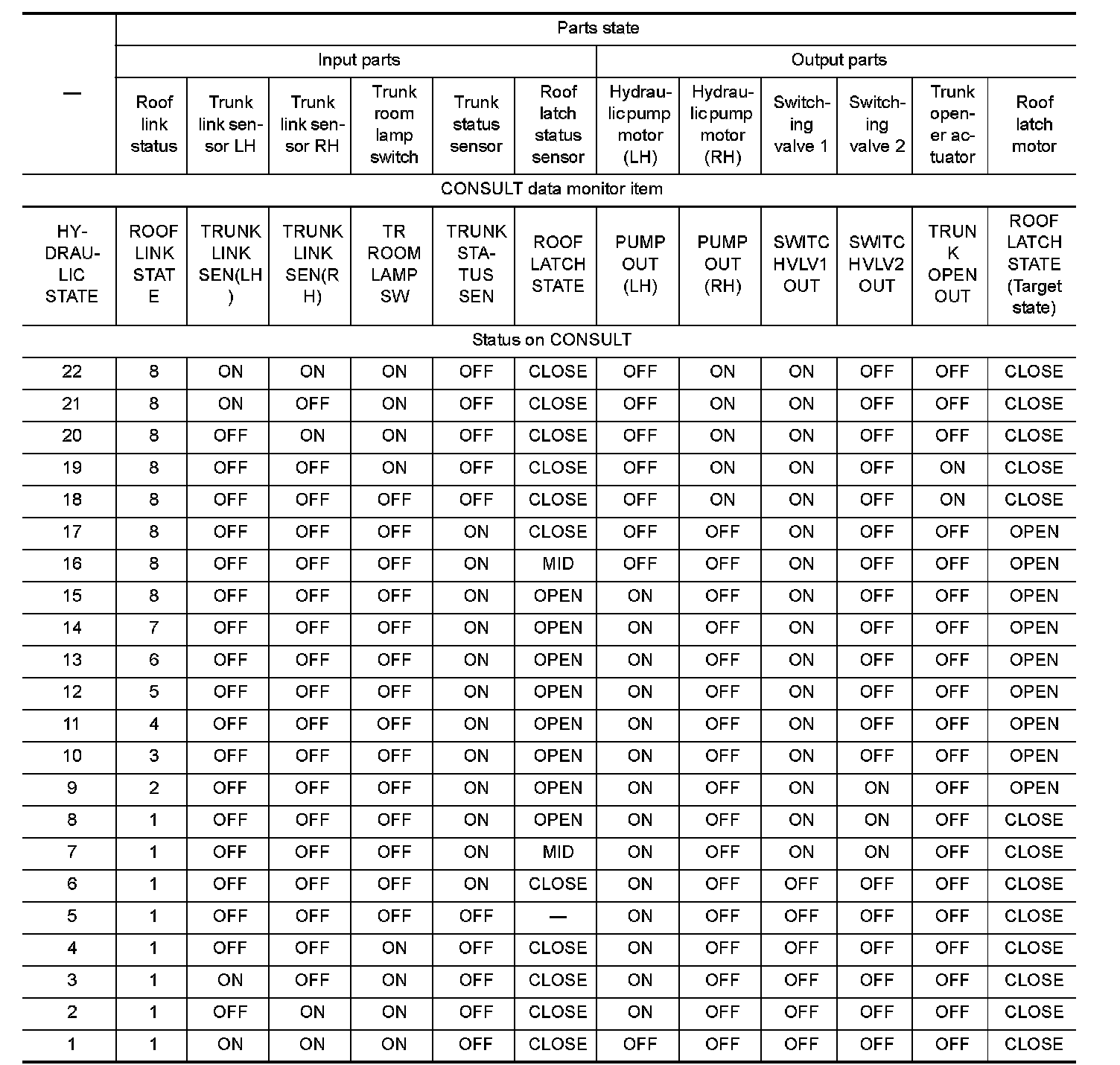 There are 22 states in hydraulic system. Hydraulic system is controlled using combination of these 22 states and, at the same time, open and close operations of retractable hard top system are performed interlocking with other retractable hard top system components. (For interlock with other components, refer to "RETRACTABLE HARD TOP SYSTEM : System Description" System Description)