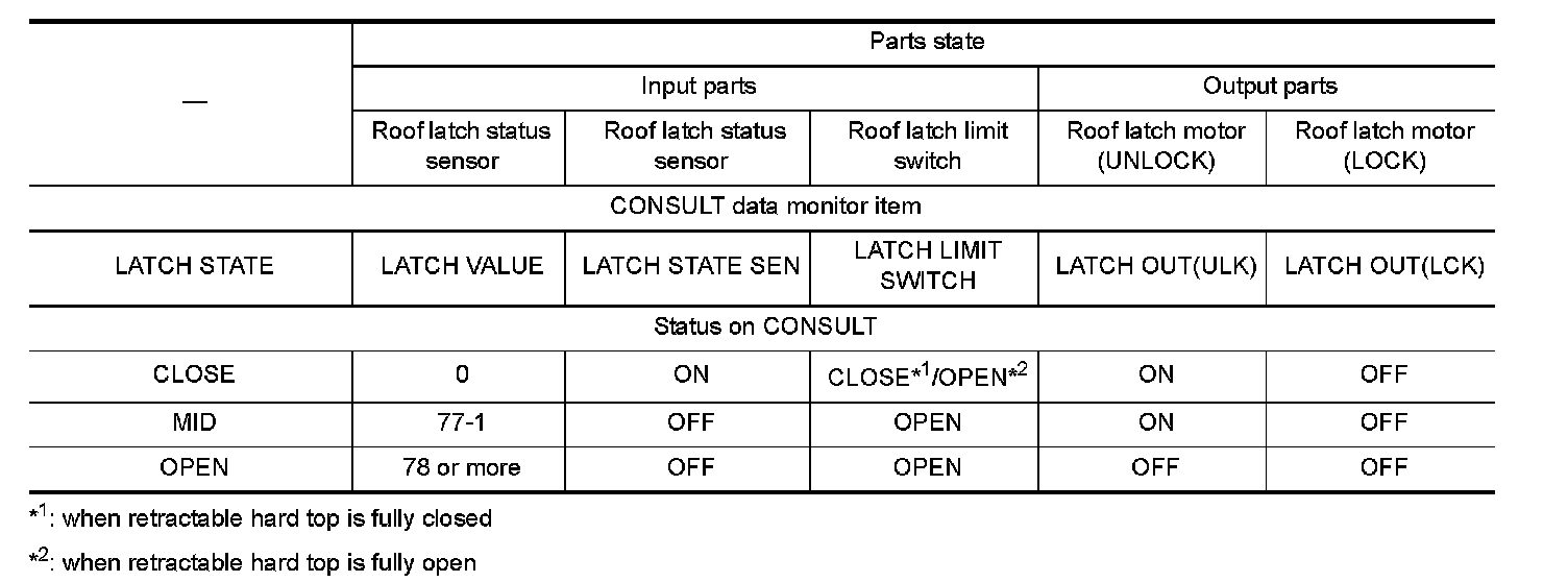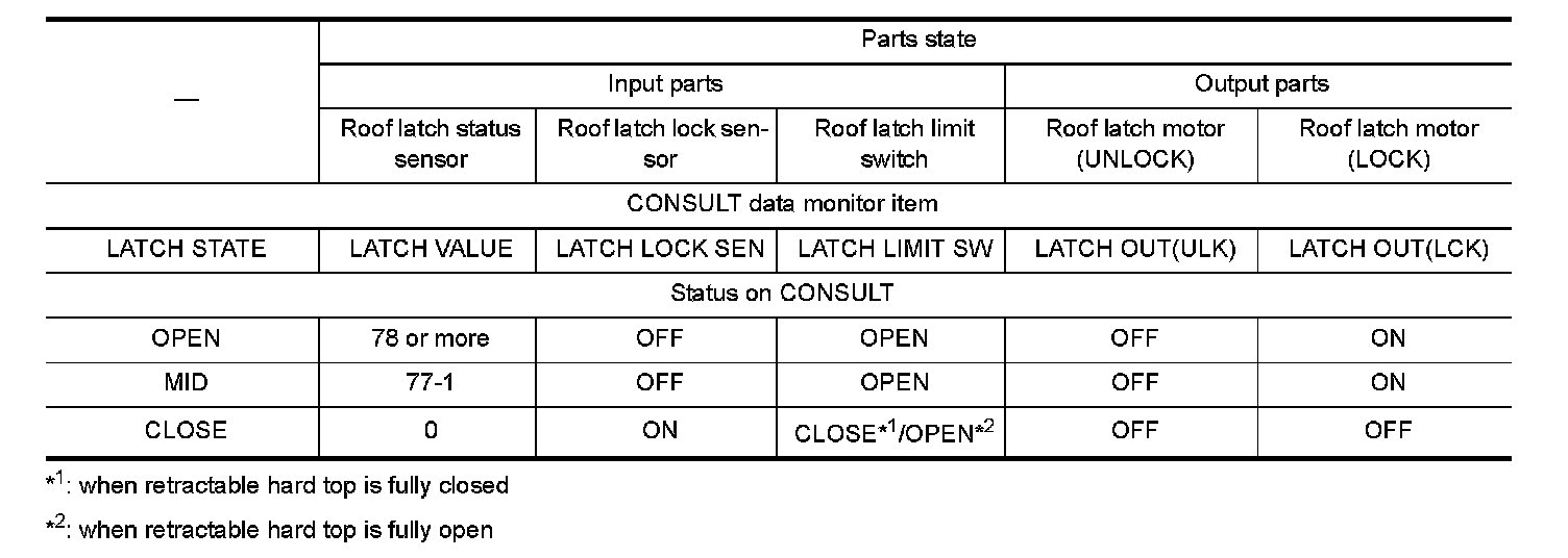 Parts state (CONSULT display) according to sequential roof latch operations is as shown in the following table.