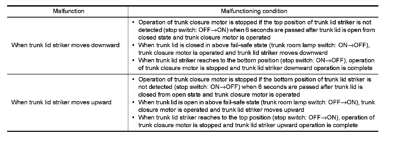 Fail-safe function is adopted to trunk lid auto closure system as per the following table.