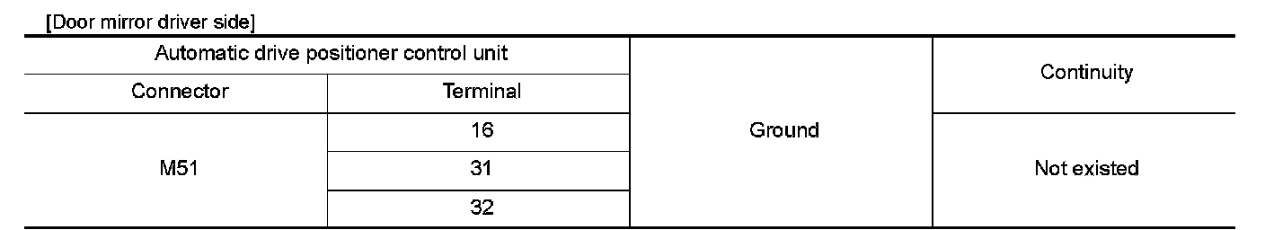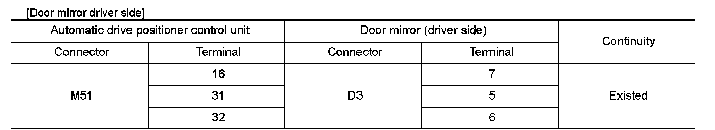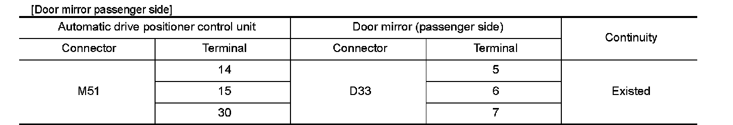 3.Check continuity between automatic drive positioner control unit connector and door mirror connector.