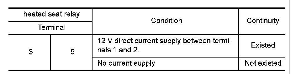 3.Check continuity between heated seat relay terminals.