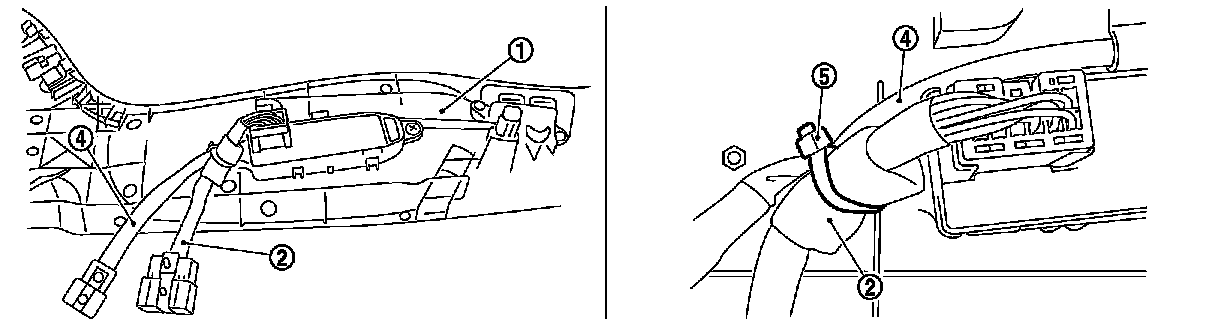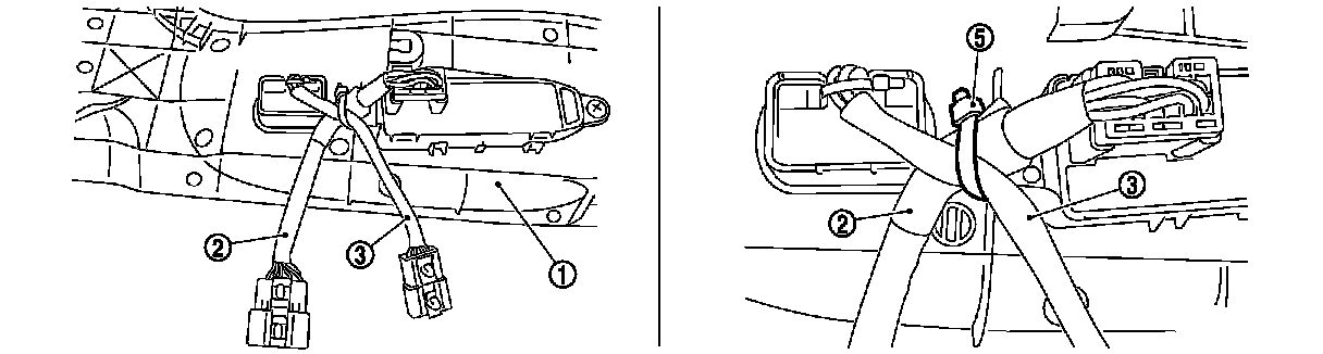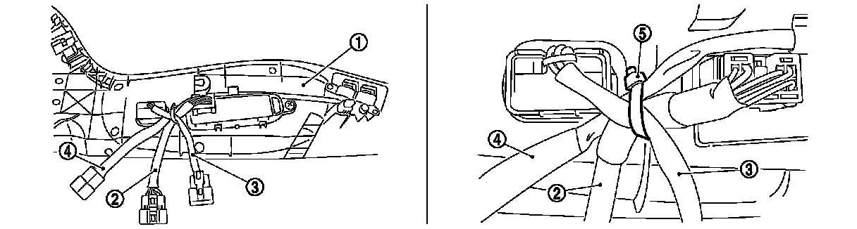 Locate side support switch harness (4) in the upper position of seat control harness (2). Locate lumbar support switch harness (3) crossing in the forehand position, and fix to seat cushion outer finisher (1) boss using a self locking band (5) as shown in the figure.