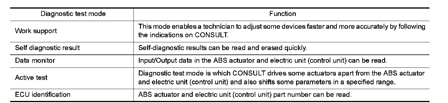 CONSULT can display each diagnostic item using the diagnostic test modes shown following.
