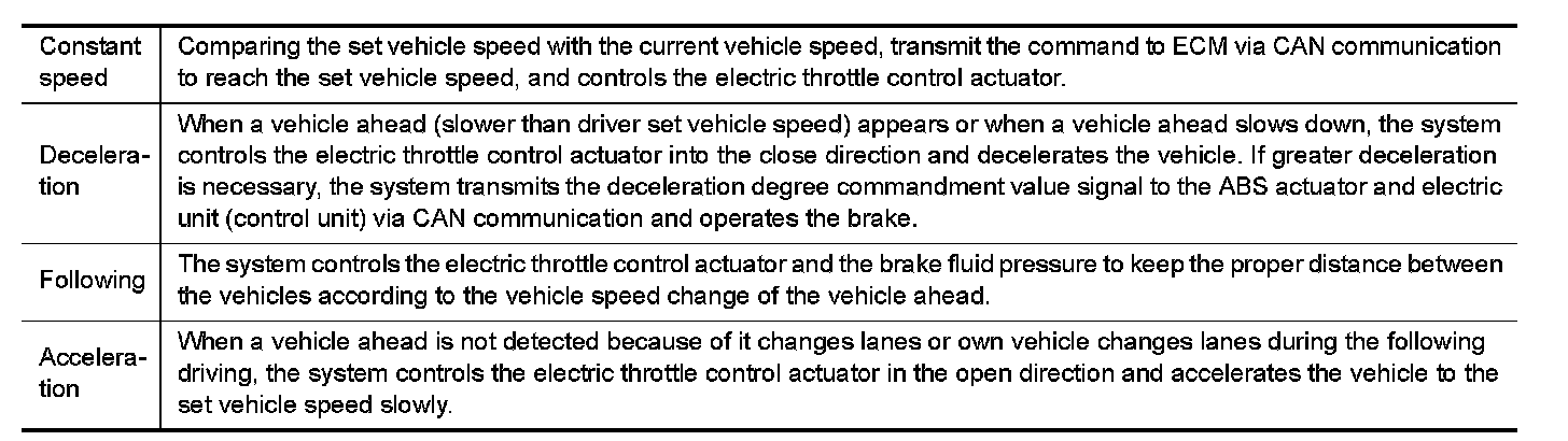 The following items are controlled in the vehicle-to-vehicle distance control mode.