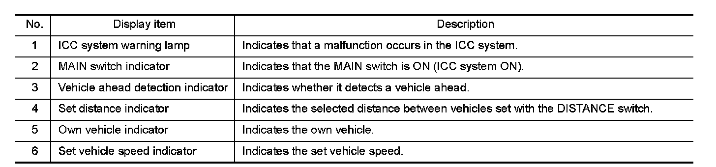 The MAIN switch indicator (cruise indicator), set distance indicator, own vehicle indicator, and set vehicle speed indicator come on and ICC system is set to a standby state.