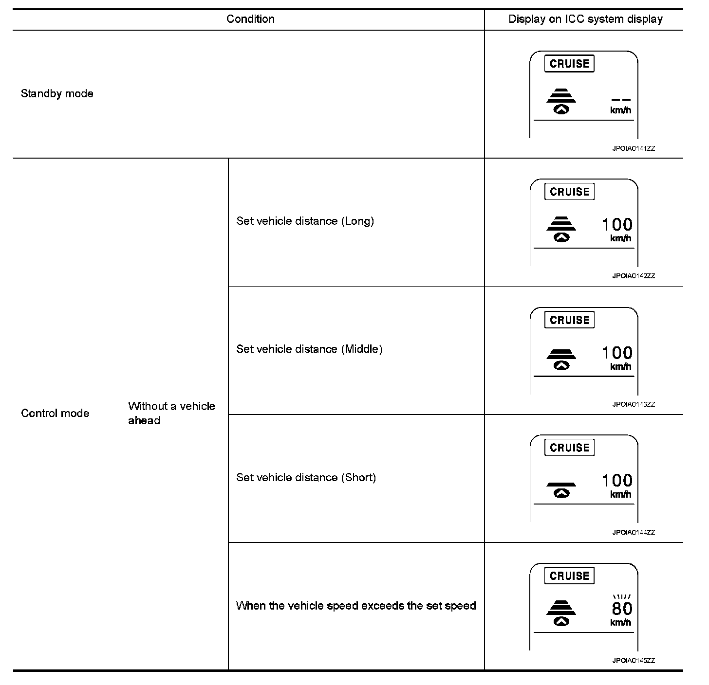 - When there are no vehicles traveling ahead, the vehicle-to-vehicle distance control mode maintains the speed set by the driver. The set speed range is between approximately 40 and 144 km/h (25 and 90 MPH).