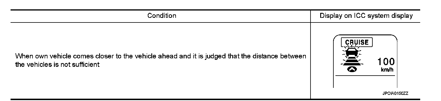 If own vehicle comes closer to a vehicle ahead due to rapid deceleration of that vehicle or if another vehicle cuts in, the system warns the driver with the chime and ICC system display. Decelerate by depressing the brake pedal to maintain a safe vehicle distance if: