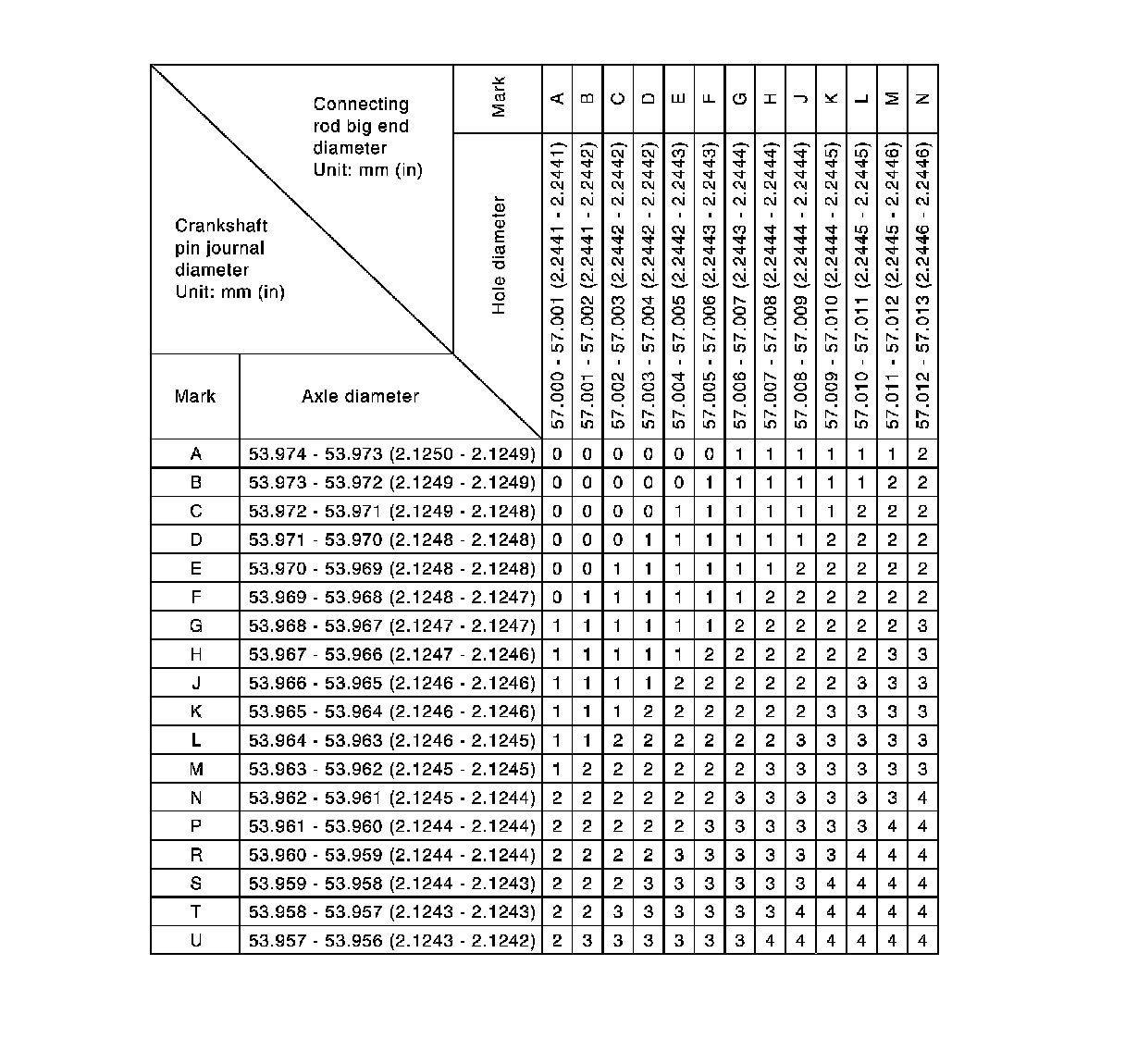 4.Apply the symbol obtained to the "CONNECTING ROD BEARING GRADE TABLE" to select connecting rod bearing.