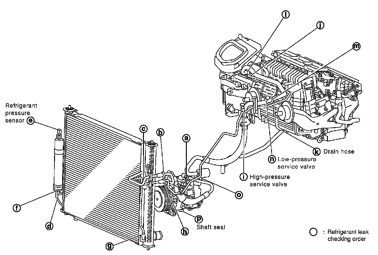 4.Perform the leakage test in the numerical as shown in the figure. [high-pressure side (compressor discharge "a" to evaporator inlet "j") to low-pressure side (evaporator drain hose "k" to shaft seal "p")]