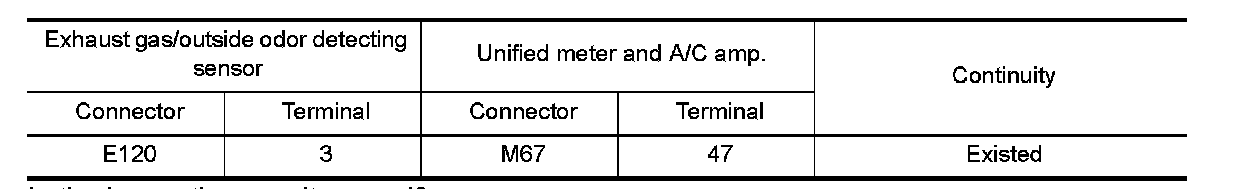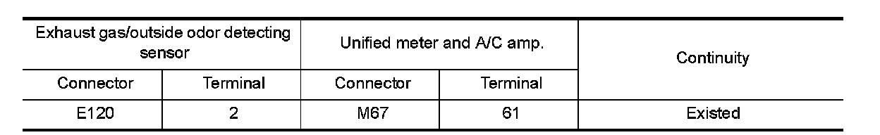 3.Check continuity between exhaust gas/outside odor detecting sensor harness connector and unified meter and A/C amp. harness connector.