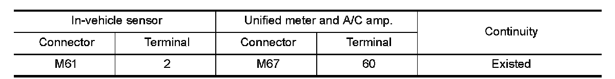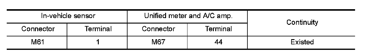 3.Check continuity between in-vehicle sensor harness connector and unified meter and A/C amp. harness connector.