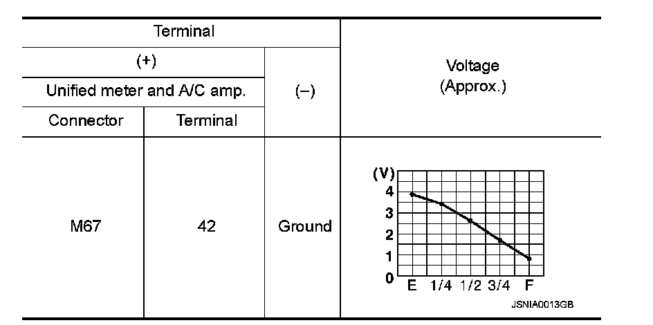 3.Check continuity between unified meter and A/C amp. harness connector terminal and fuel level sensor unit (sub) harness connector terminal.