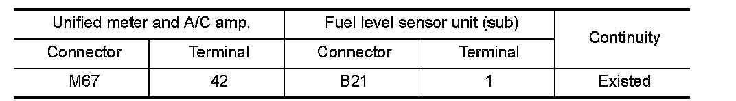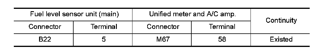 Check continuity between fuel level sensor unit and fuel pump (main) harness connector terminal and unified meter and A/C amp. harness connector terminal.