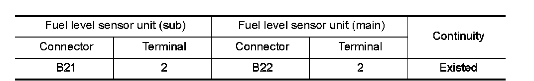2.Check continuity between fuel level sensor unit (sub) harness connector terminal and fuel level sensor unit and fuel pump (main) harness connector terminal.
