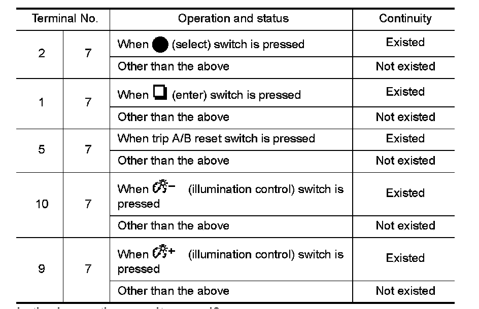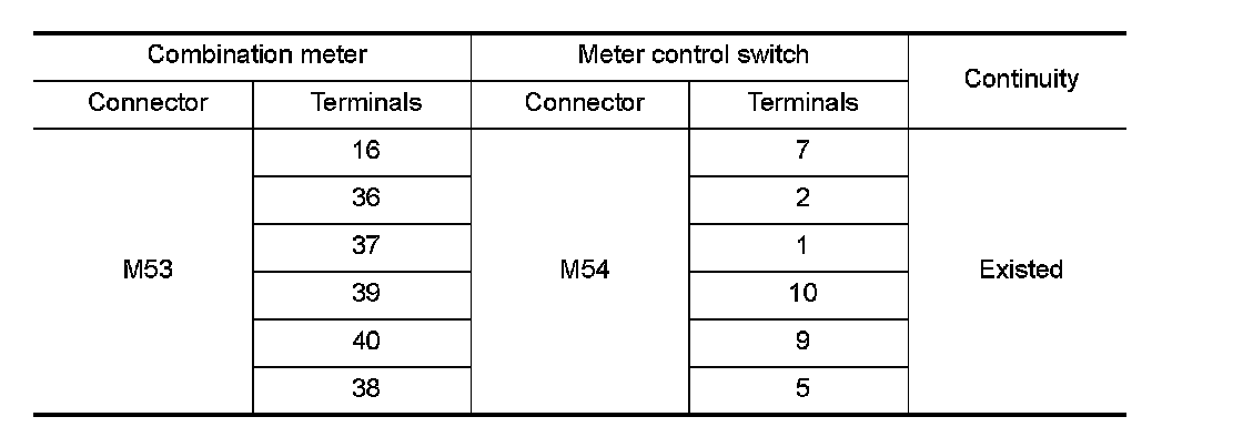 3.Check continuity between combination meter harness connector terminal and meter control switch harness connector terminal.