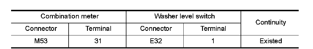 3.Check continuity between combination meter harness connector terminal and washer level switch harness connector terminal.