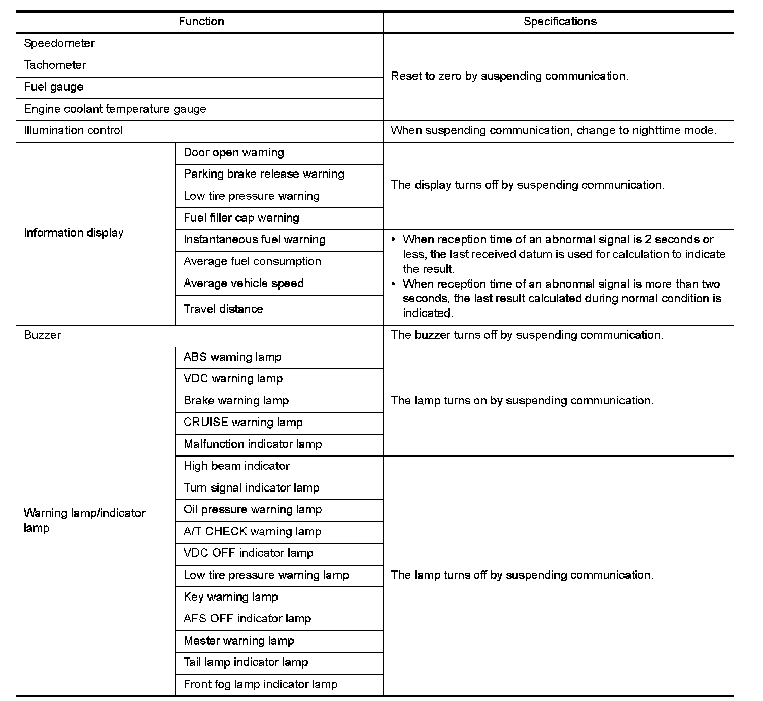 Combination meter performs fail-safe operation when unified meter and A/C amp. communication is malfunction.