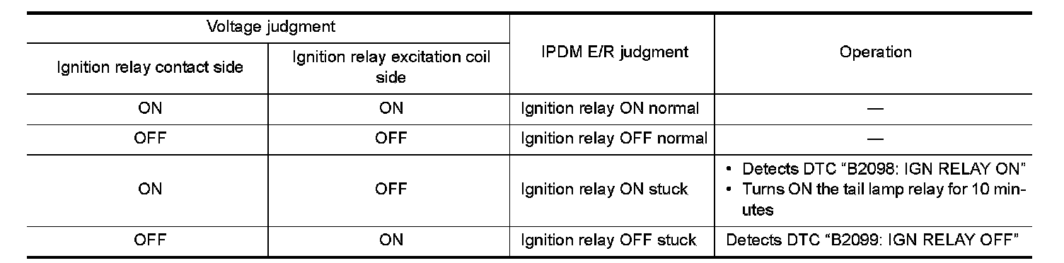- IPDM E/R judges the ignition relay error if the voltage differs between the contact circuit and the excitation coil circuit.